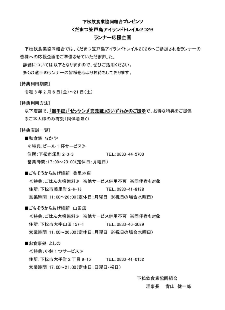 大会期間中、下松市内の対象飲食店にて「選手証」「ゼッケン」「完走証」のいずれかをご提示いただくと、